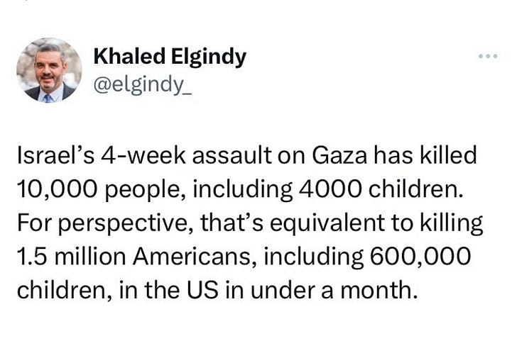 The most conservative estimate is around 10,000 men, women and children have been killed (it's now 30,000). I am loathe to separate out women and children because the men of Palestine deserve life just as much as anyone. And Muslim men have been dehumanised and denigrated in the West in a myriad of ways. But, it must be said that Israeli airstrikes are killing Palestinian children at a staggering rate. Save the Children has said that more children have been killed in Gaza in three weeks than all global conflict annually since 2019. The UN has called Gaza a “graveyard for children”.