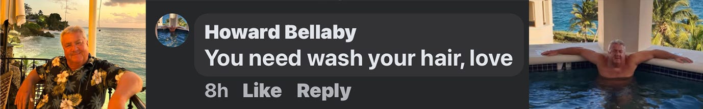 Ed Murray says “Get some makeup on for gods sake your [sic] frightining [sic] people” and Mike Flavell says “Did you just get out of bed. Look at the state of those bags and wrinkles”.