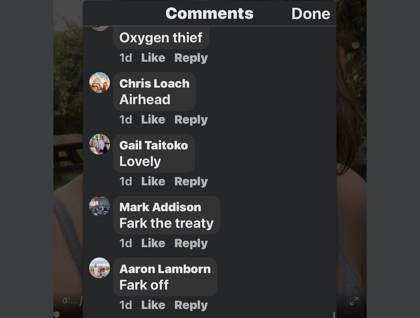 There are a tiny number of women attacking her, Lorraine Henson says “go back to your own country stupid woman” and Pam Bentley asks if she’s been drinking. Sarah-Hope Bailey says Aotearoa should have “a law you need to be BORN here to become an MP”.