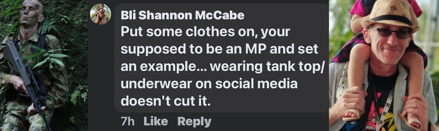 Bli Shannon McCabe whose profile photos includes a small child on his shoulders berates her for wearing a singlet. Justin Haworth turns a disability into a slur about her appearance.